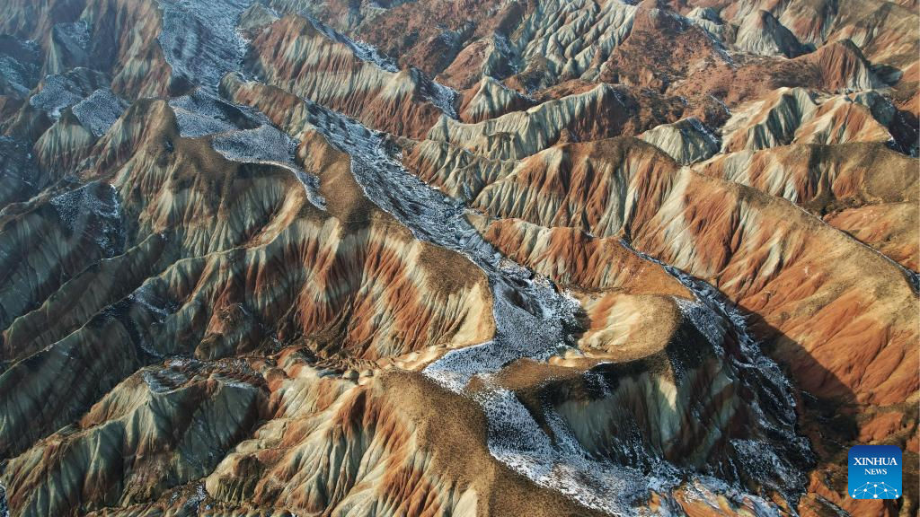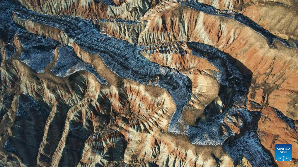 An aerial drone photo taken on Jan. 17, 2025 shows a view of the Danxia landform, characterized by reddish sandstone features, at the Shuimo Danxia scenic area in Lanzhou, northwest China's Gansu Province. (Xinhua/Chen Bin)