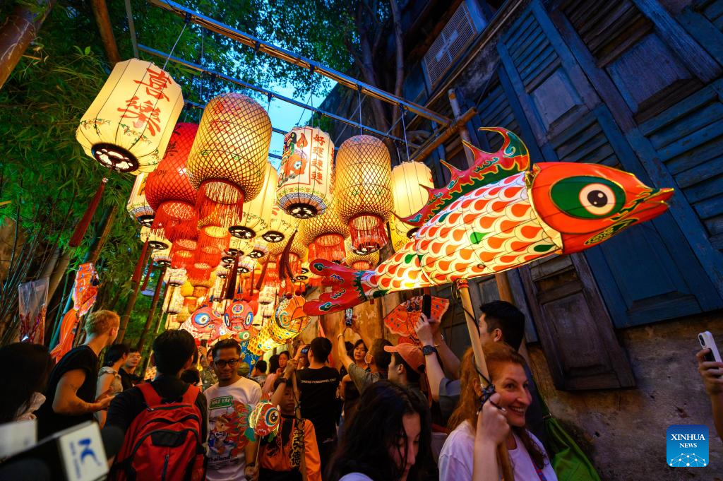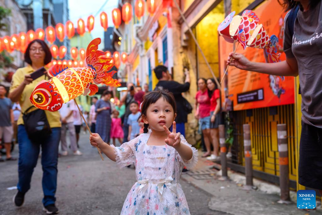 People pose for photos with lanterns in Kuala Lumpur, Malaysia, Jan. 18, 2025. Celebrations and cultural activities are being held around the globe to welcome the upcoming Chinese New Year. (Xinhua/Chong Voon Chung)