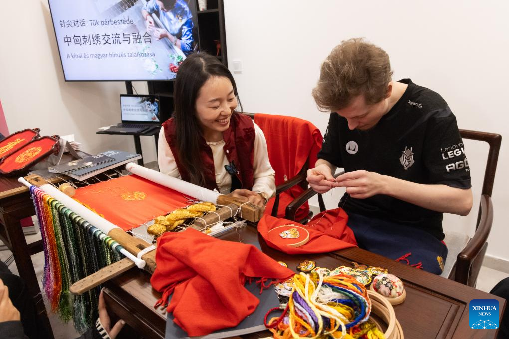 A man tries Suzhou embroidery at a Chinese culture promoting event in Budapest, Hungary, Jan. 17, 2025. Celebrations and cultural activities are being held around the globe to welcome the upcoming Chinese New Year. (Photo by Attila Volgyi/Xinhua)