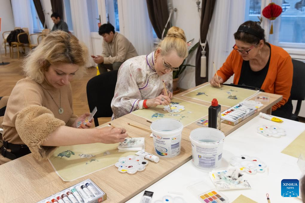 People learn Chinese paintings at a Chinese culture promoting event in Budapest, Hungary, Jan. 17, 2025. Celebrations and cultural activities are being held around the globe to welcome the upcoming Chinese New Year. (Photo by Attila Volgyi/Xinhua)