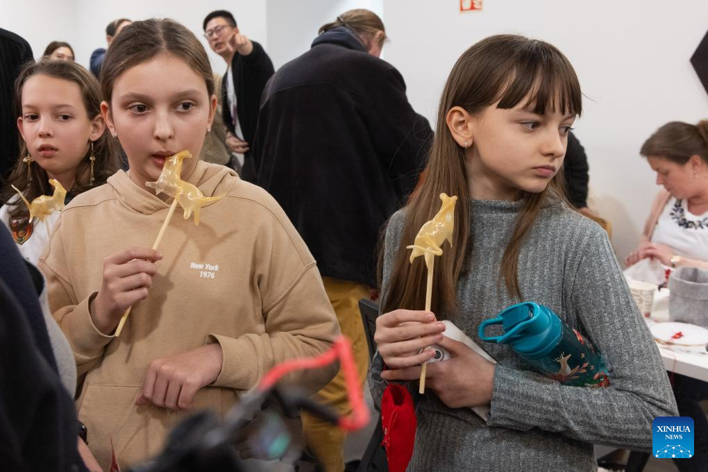 Children hold sugar figures at a Chinese culture promoting event in Budapest, Hungary, Jan. 17, 2025. Celebrations and cultural activities are being held around the globe to welcome the upcoming Chinese New Year. (Photo by Attila Volgyi/Xinhua)