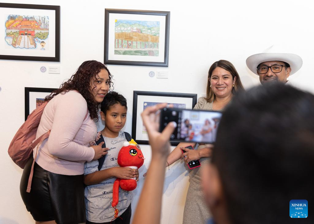 A contestant pose for photos with her family during the 11th "China in My Imagination" children's painting contest in Mexico City, Mexico, on Jan. 18, 2025. Celebrations and cultural activities are being held around the globe to welcome the upcoming Chinese New Year. (Xinhua/Li Mengxin)
