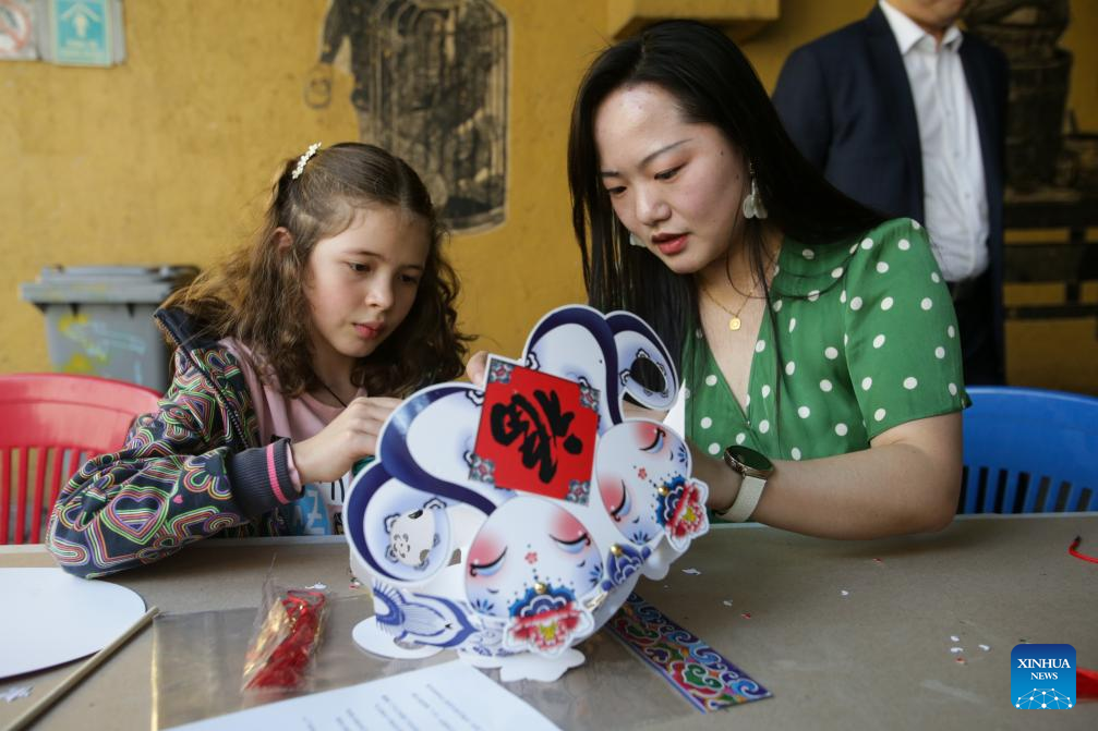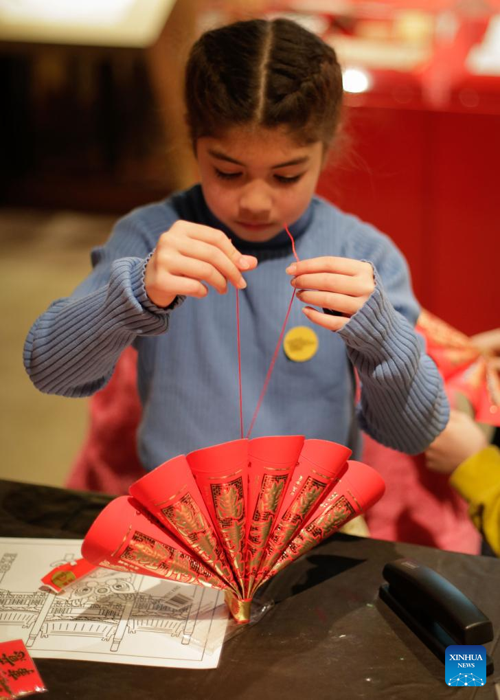 A girl learns to make Spring Festival decorations during the 11th "China in My Imagination" children's painting contest in Mexico City, Mexico, Jan. 18, 2025. Celebrations and cultural activities are being held around the globe to welcome the upcoming Chinese New Year. (Photo by Francisco Canedo/Xinhua)