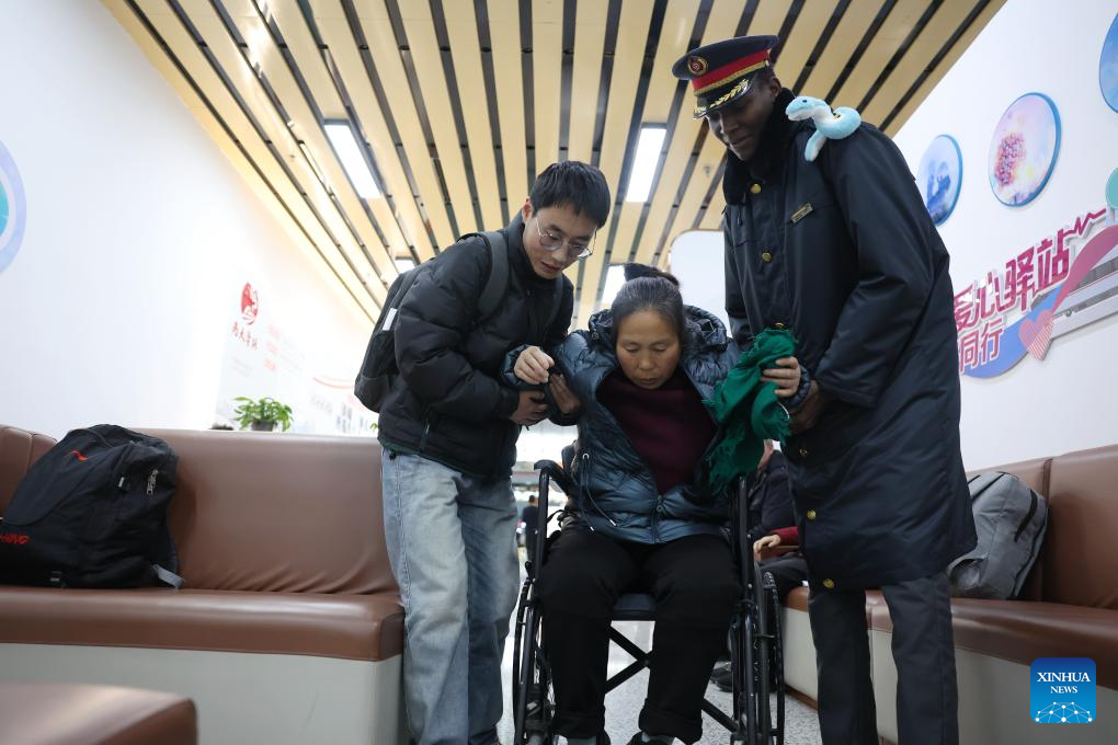 Student volunteer Kalbe Brai Madoue from Chad helps a passenger at the waiting hall of the Lanzhou West Railway Station in Lanzhou, northwest China's Gansu Province, Jan. 18, 2025. (Xinhua/Chen Bin)