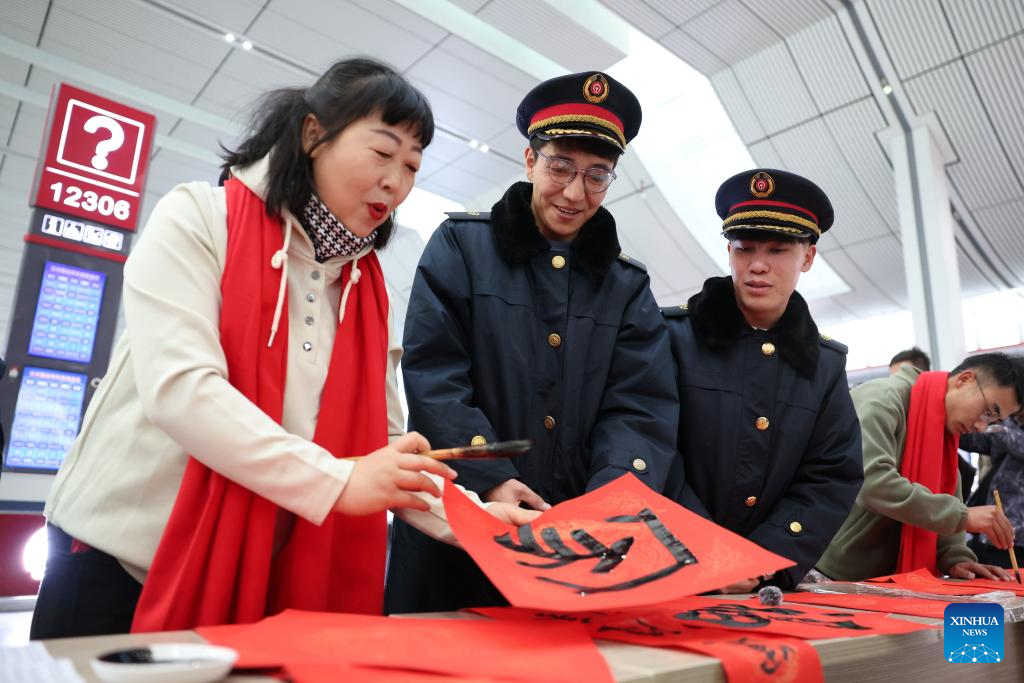 Student volunteer Ali Reza Rezaie (C) from Afghanistan writes Spring Festival couplets with calligraphy lovers at Lanzhou West Railway Station in Lanzhou, northwest China's Gansu Province, Jan. 18, 2025. (Xinhua/Chen Bin)