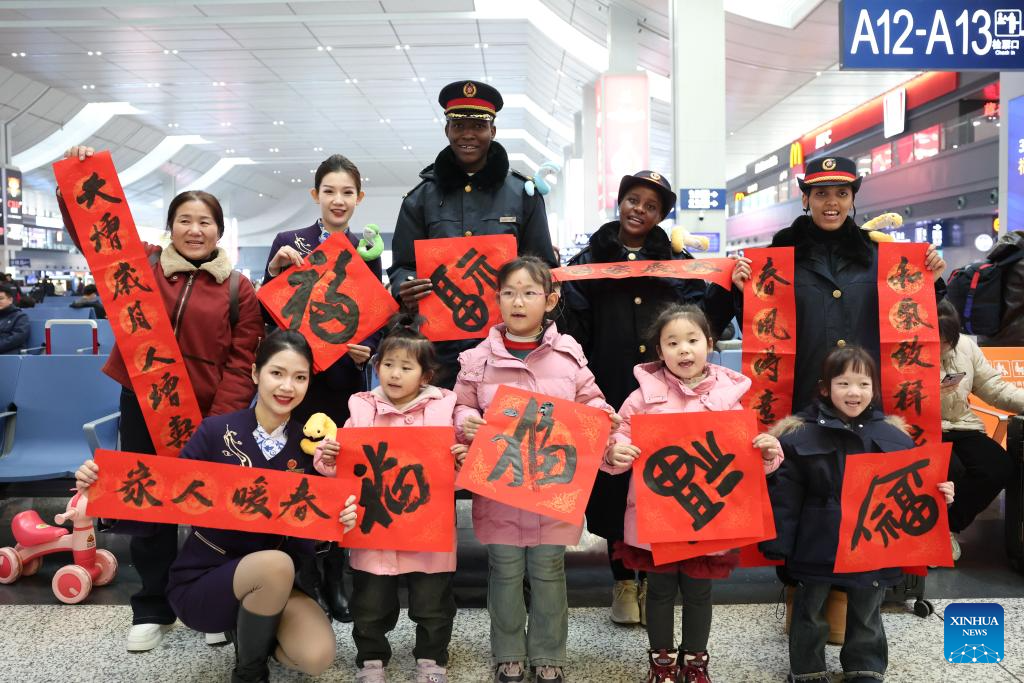Foreign student volunteers pose for photos with railway workers and passengers at Lanzhou West Railway Station in Lanzhou, northwest China's Gansu Province, Jan. 18, 2025. (Xinhua/Chen Bin)