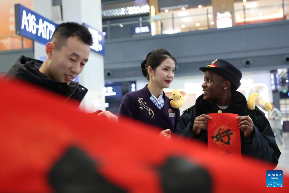 Student volunteer Sylvia Ngaira (R) from Kenya presents Spring Festival couplets to passengers at Lanzhou West Railway Station in Lanzhou, northwest China's Gansu Province, Jan. 18, 2025. (Xinhua/Chen Bin)