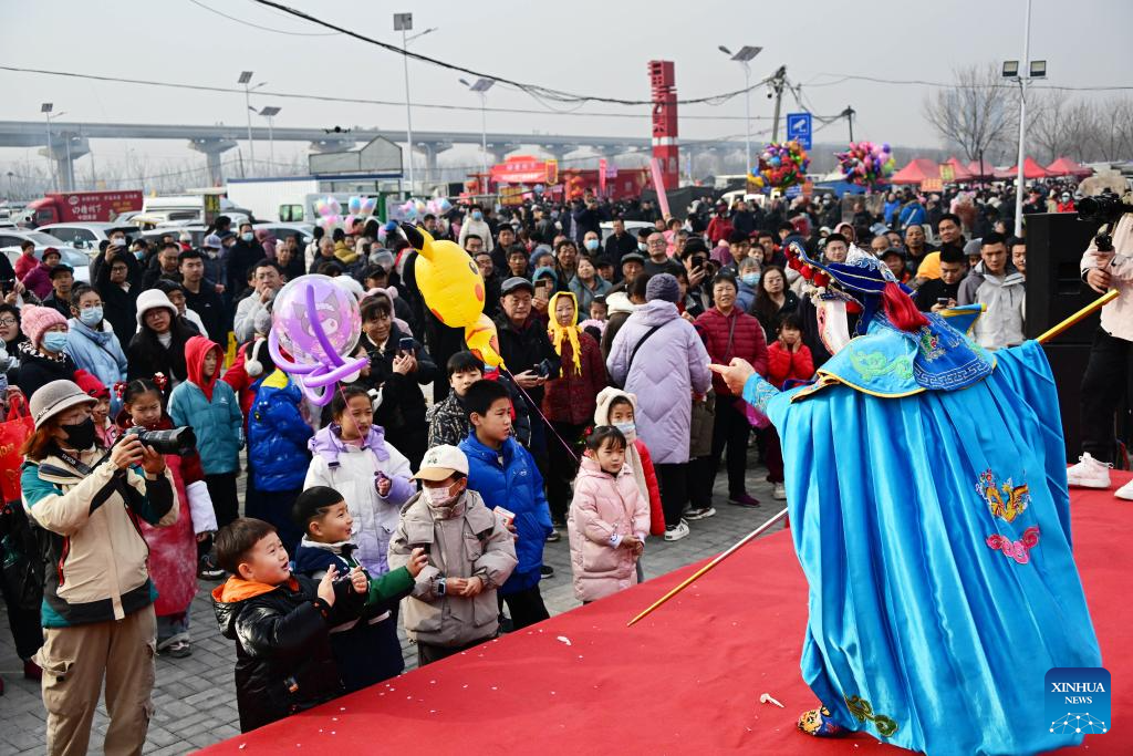 People watch an opera performance at the Poli Market in Qingdao Xihai'an (West Coast) New Area in Qingdao, east China's Shandong Province, Jan. 18, 2025. With a history of more than 300 years, the Poli Market is a local intangible cultural heritage and one of the biggest traditional markets in eastern Shandong Province. As the Spring Festival approaches, many visitors flock to the market for abundant new year decorations, agricultural products, local delicacies and so on. (Xinhua/Li Ziheng)