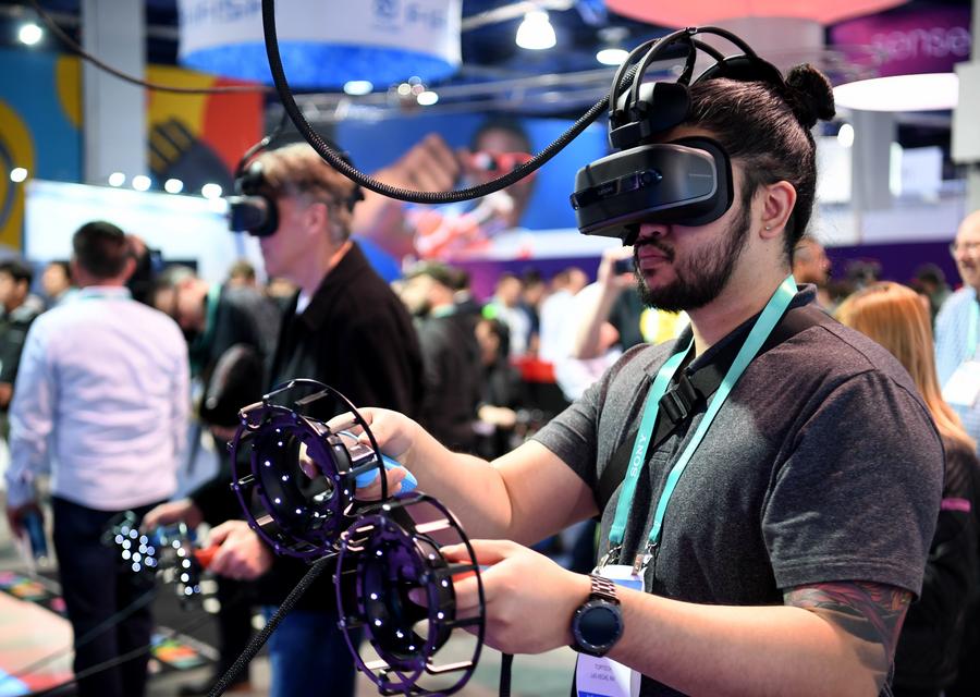 Visitors try VR (virtual reality) games during the 2020 Consumer Electronics Show (CES) in Las Vegas, the United States, Jan. 9, 2020. (Xinhua/Wu Xiaoling)