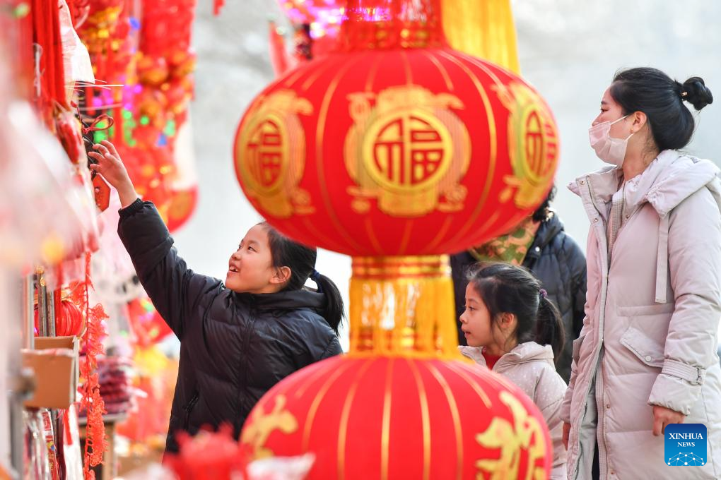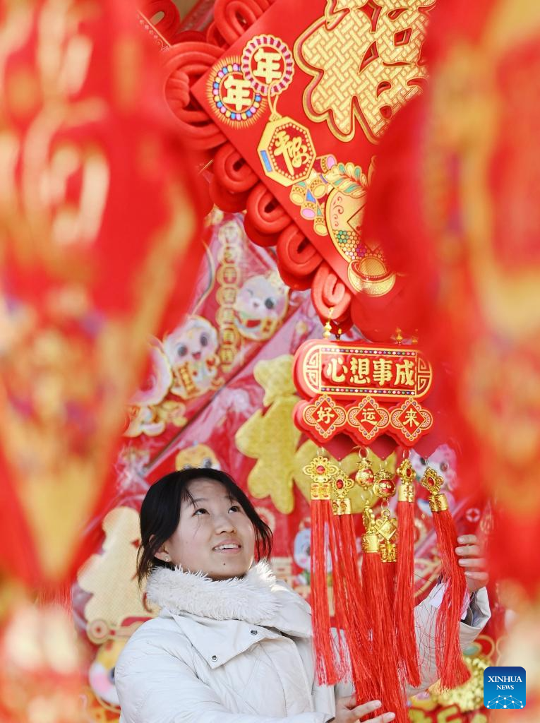 A customer selects Spring Festival decorations at a market in Tengzhou City, east China's Shandong Province, Jan. 17, 2025. Various activities were held across the country to welcome the upcoming Chinese New Year, or Spring Festival, which falls on Jan. 29 this year. (Photo by Li Zhijun/Xinhua)