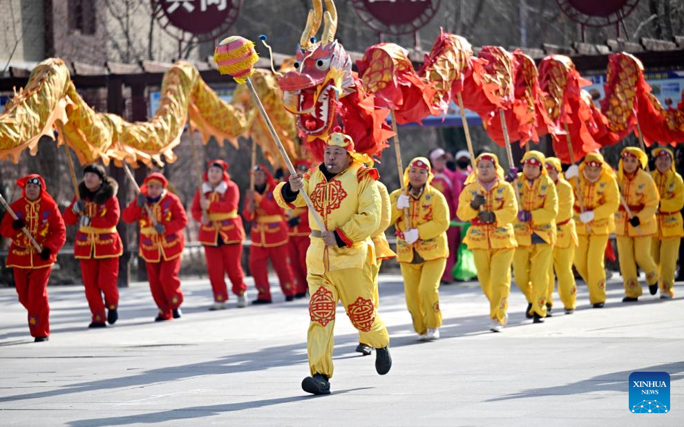 People take part in a dragon dance rehearsal in Yinchuan, northwest China's Ningxia Hui Autonomous Region, Jan. 18, 2025. Various activities were held across the country to welcome the upcoming Chinese New Year, or Spring Festival, which falls on Jan. 29 this year. (Xinhua/Wang Peng)