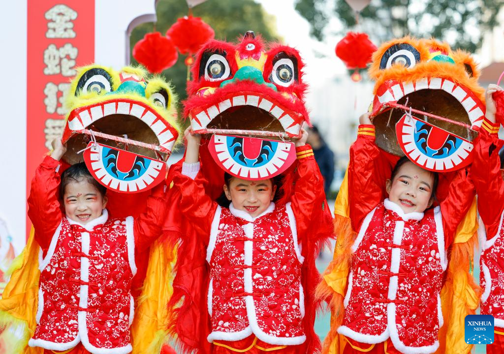 Children try lion dance at a kindergarten in Huangshan City, east China's Anhui Province, Jan. 17, 2025. Various activities were held across the country to welcome the upcoming Chinese New Year, or Spring Festival, which falls on Jan. 29 this year. (Photo by Shi Yalei/Xinhua)
