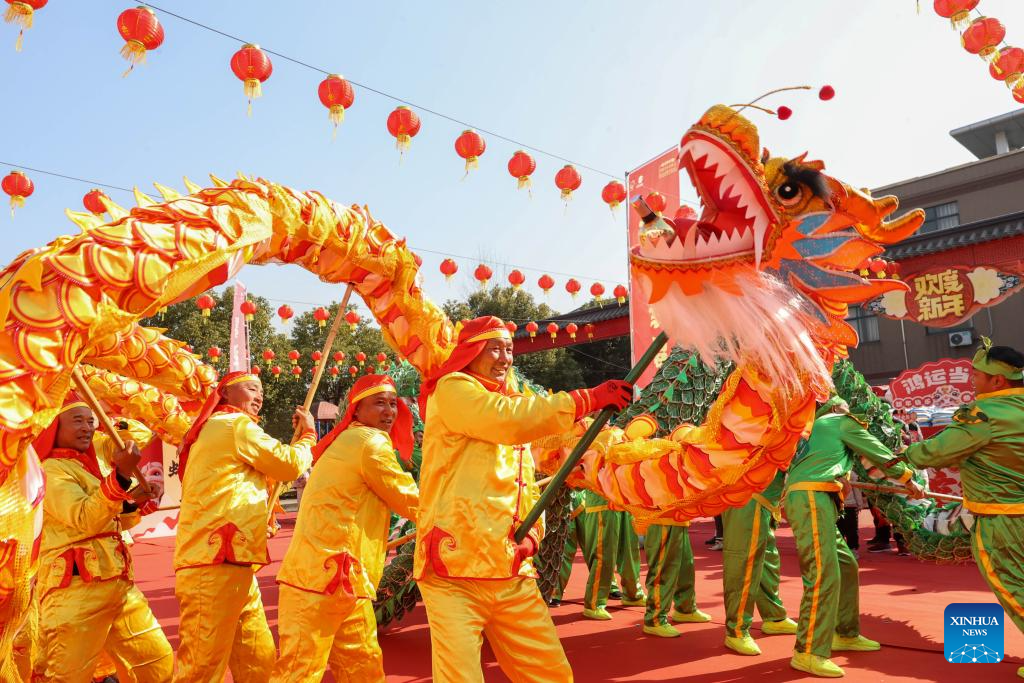 People perform dragon dance during an event celebrating the upcoming Spring Festival at Caijie Village in Huzhou City, east China's Zhejiang Province, Jan. 18, 2025. Various activities were held across the country to welcome the upcoming Chinese New Year, or Spring Festival, which falls on Jan. 29 this year. (Photo by Yao Haixiang/Xinhua)
