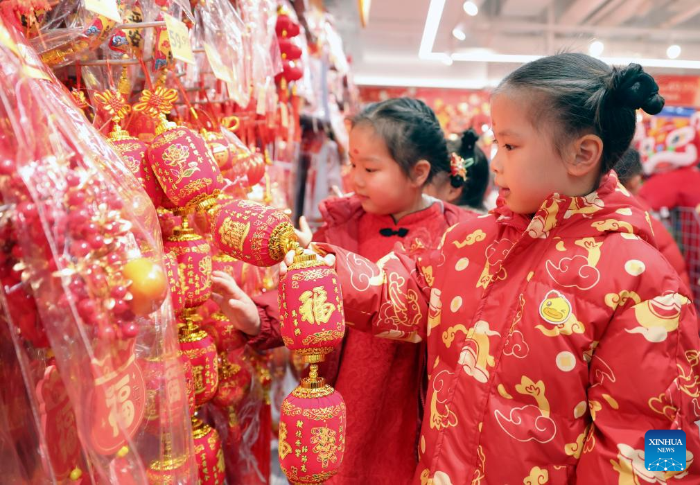 Customers select Spring Festival decorations at a supermarket in Xinle City, north China's Hebei Province, Jan. 18, 2025. Various activities were held across the country to welcome the upcoming Chinese New Year, or Spring Festival, which falls on Jan. 29 this year. (Photo by Jia Minjie/Xinhua)