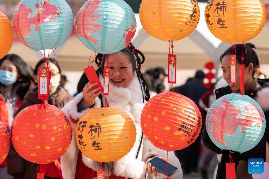Citizens take part in a riddle game during an event celebrating the upcoming Spring Festival in Jinhua City, east China's Zhejiang Province, Jan. 17, 2025. Various activities were held across the country to welcome the upcoming Chinese New Year, or Spring Festival, which falls on Jan. 29 this year. (Photo by Hu Xiaofei/Xinhua)