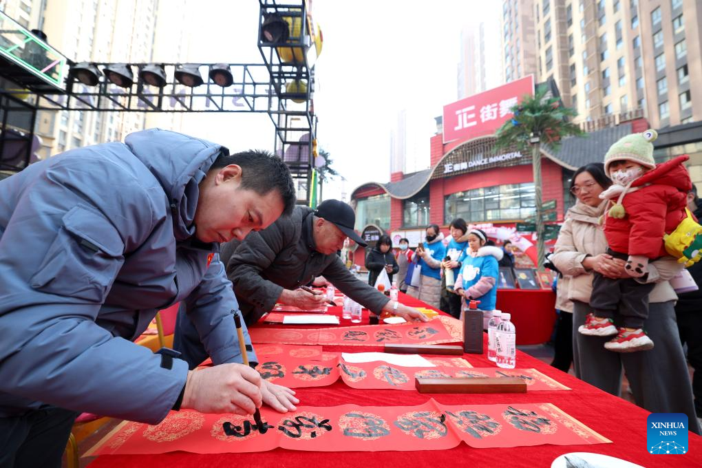 Calligraphers write Spring Festival couplets for tourists during an event celebrating the upcoming Spring Festival in Shijiazhuang City, north China's Hebei Province, Jan. 18, 2025. Various activities were held across the country to welcome the upcoming Chinese New Year, or Spring Festival, which falls on Jan. 29 this year. (Photo by Liang Zidong/Xinhua)