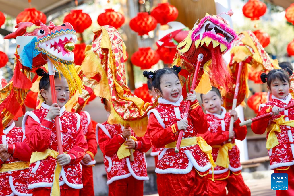 Children try dragon dance at a kindergarten in Huangshan City, east China's Anhui Province, Jan. 17, 2025. Various activities were held across the country to welcome the upcoming Chinese New Year, or Spring Festival, which falls on Jan. 29 this year. (Photo by Shi Yalei/Xinhua)