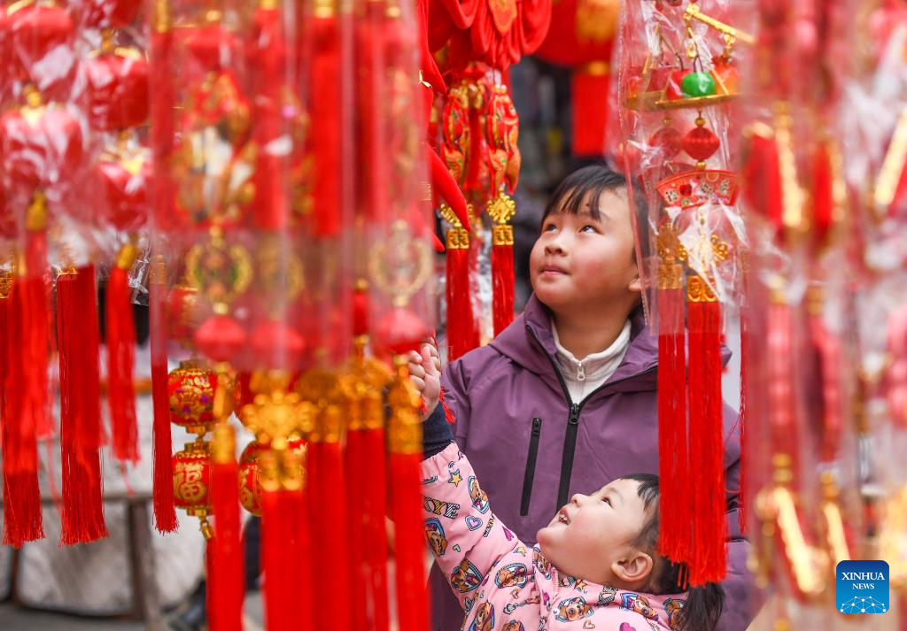 Children select Spring Festival decorations at a market in Yongzhou City, central China's Hunan Province, Jan. 18, 2025. Various activities were held across the country to welcome the upcoming Chinese New Year, or Spring Festival, which falls on Jan. 29 this year. (Photo by Jiang Keqing/Xinhua)