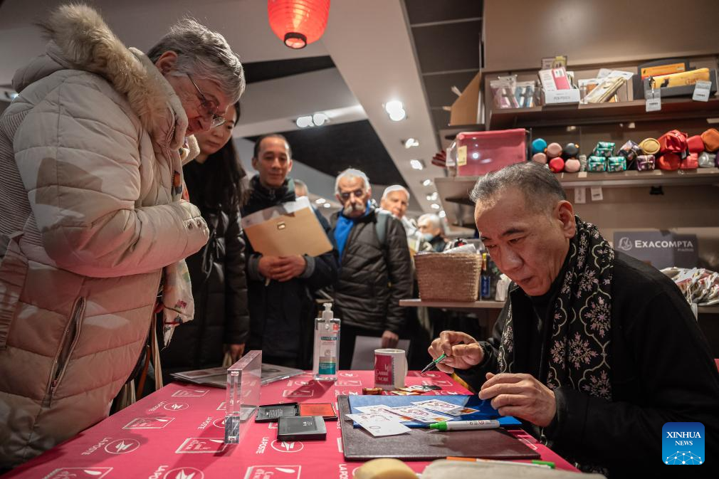 Chen Jianghong (R), a French artist of Chinese origin, also the designer of the stamps, signs on the Year of the Snake commemorative stamps during a launching ceremony in Paris, France, Jan. 18, 2025. French post office, La Poste, on Saturday issued two stamps to celebrate the upcoming Chinese New Year, the Year of the Snake, which starts on Jan. 29, 2025. (Photo by Aurelien Morissard/Xinhua)