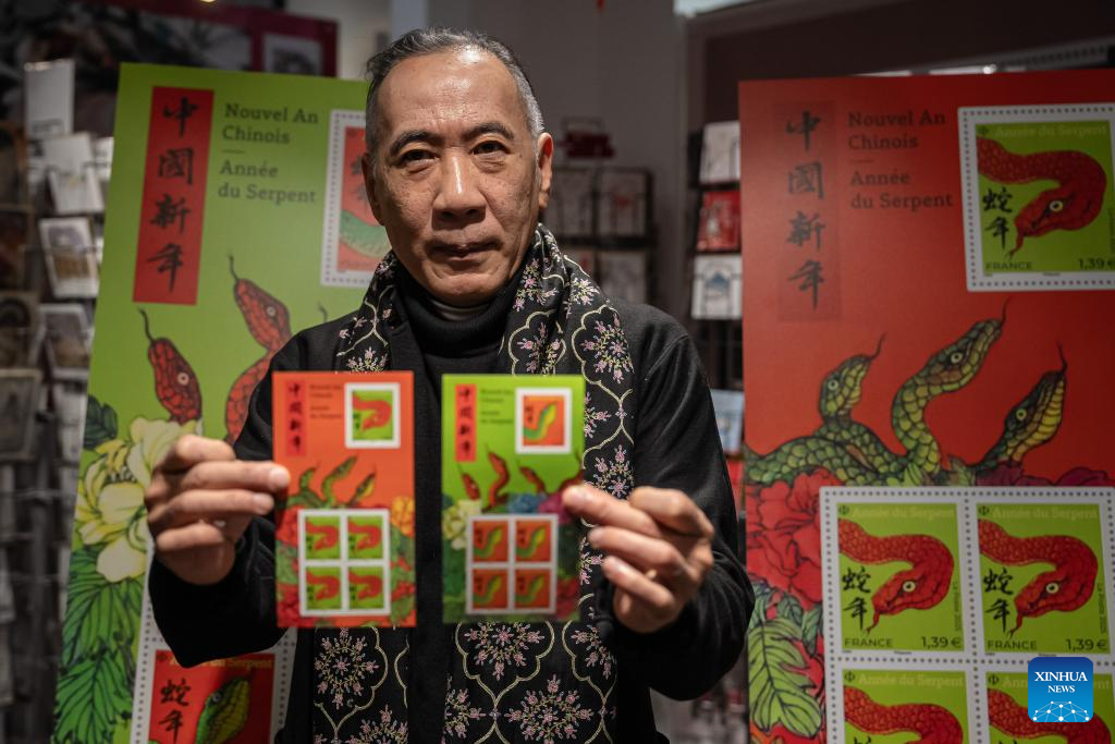 Chen Jianghong, a French artist of Chinese, origin also the designer of the stamps, displays the Year of the Snake commemorative stamps during a launching ceremony in Paris, France, Jan. 18, 2025. French post office, La Poste, on Saturday issued two stamps to celebrate the upcoming Chinese New Year, the Year of the Snake, which starts on Jan. 29, 2025. (Photo by Aurelien Morissard/Xinhua)