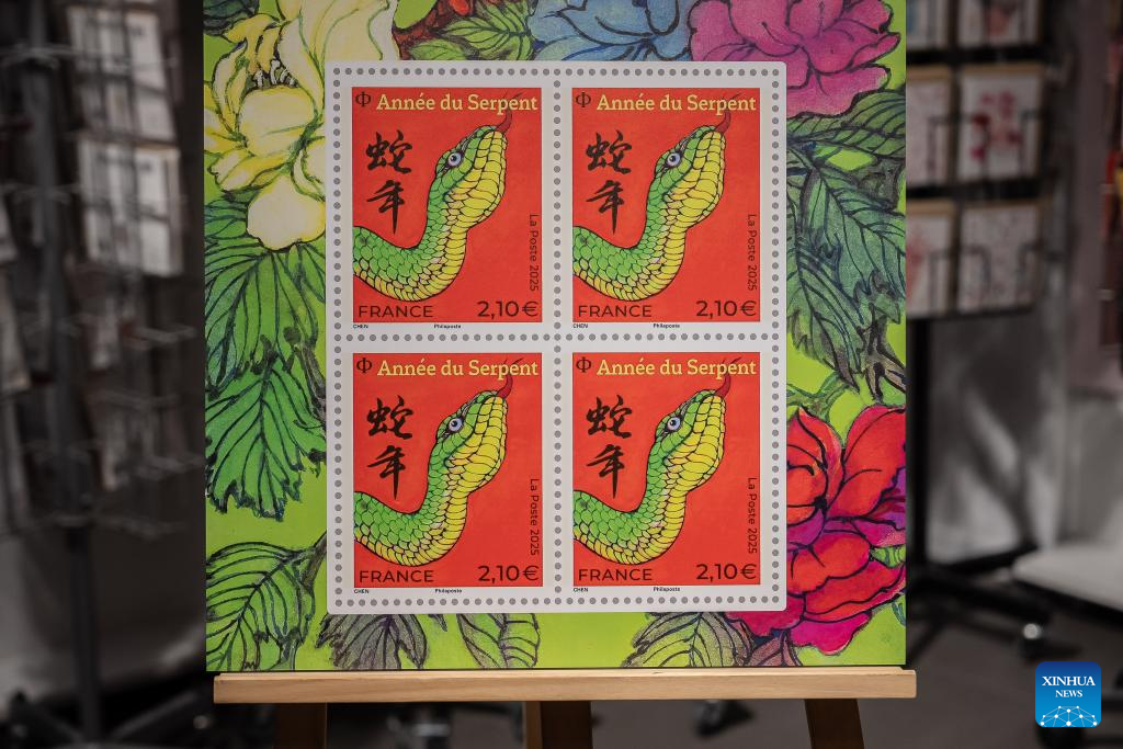 This photo taken on Jan. 18, 2025 shows the Year of the Snake commemorative stamps during a launching ceremony in Paris, France. French post office, La Poste, on Saturday issued two stamps to celebrate the upcoming Chinese New Year, the Year of the Snake, which starts on Jan. 29, 2025. (Photo by Aurelien Morissard/Xinhua)