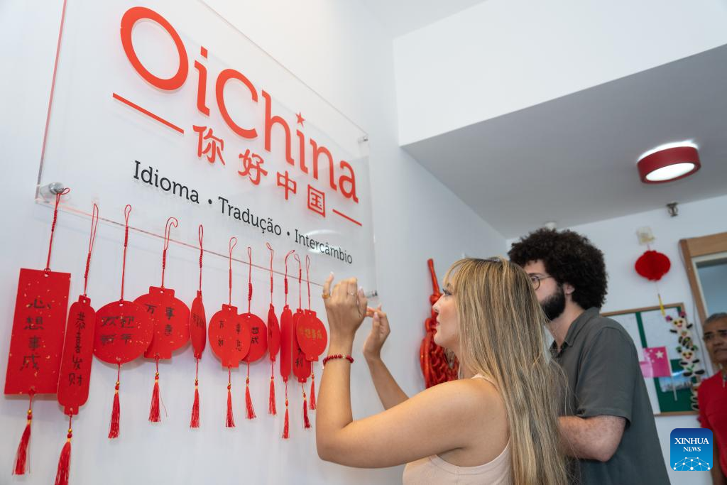 People hang the Spring Festival decorations they made on the wall at a Chinese New Year cultural experience event in Rio de Janeiro, Brazil, on Jan. 18, 2025. The cultural experience event celebrating the Chinese New Year was held at the "OiChina" Chinese language school in Rio de Janeiro on Saturday. (Xinhua/Wang Tiancong)