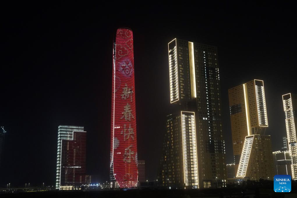 This photo taken on Jan. 19, 2025 shows the Iconic Tower decorated in a festive LED illumination ahead of the Chinese Lunar New Year at the Central Business District (CBD) in the new administrative capital of Egypt. (Xinhua/Yao Bing)