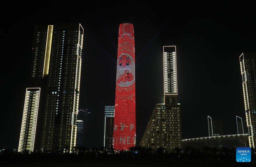 This photo taken on Jan. 19, 2025 shows the Iconic Tower decorated in a festive LED illumination ahead of the Chinese Lunar New Year at the Central Business District (CBD) in the new administrative capital of Egypt. (Xinhua/Sui Xiankai)