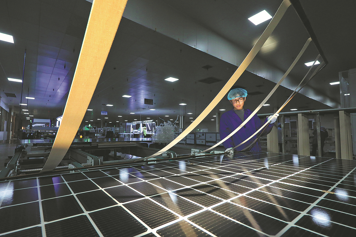 An employee works in a photovoltaic module production workshop at a new energy company in Shangqiu, Henan province, on Jan 3. (Li Heng/Xinhua)