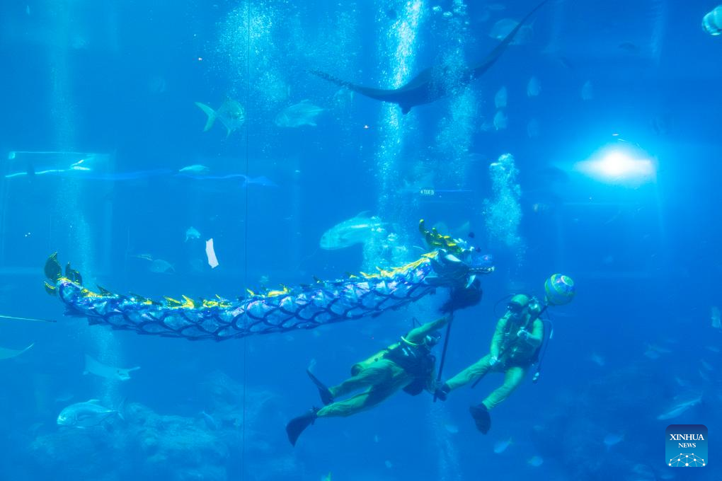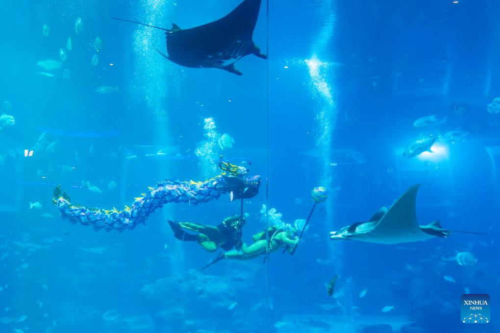 Divers perform underwater dragon dance in celebration of the upcoming Chinese Lunar New Yea at the S.E.A. Aquarium in Singapore, Jan. 20, 2025. (Photo by Then Chih Wey/Xinhua)
