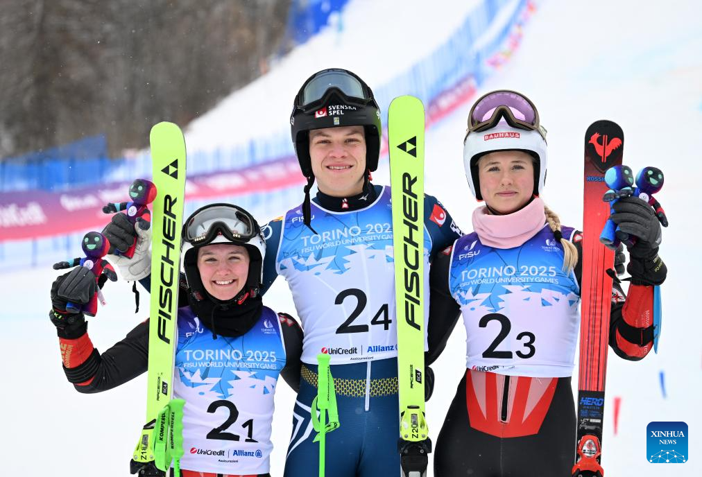 Gold medalists Regina Falk, Axel Lindqvist and Stella Rodling Swanberg (L to R) of Team Sweden celebrate after the finals of the alpine skiing mixed team parallel competition at the 2025 FISU Winter World University Games in Bardonecchia, Italy, Jan. 20, 2025. (Xinhua/He Canling)
