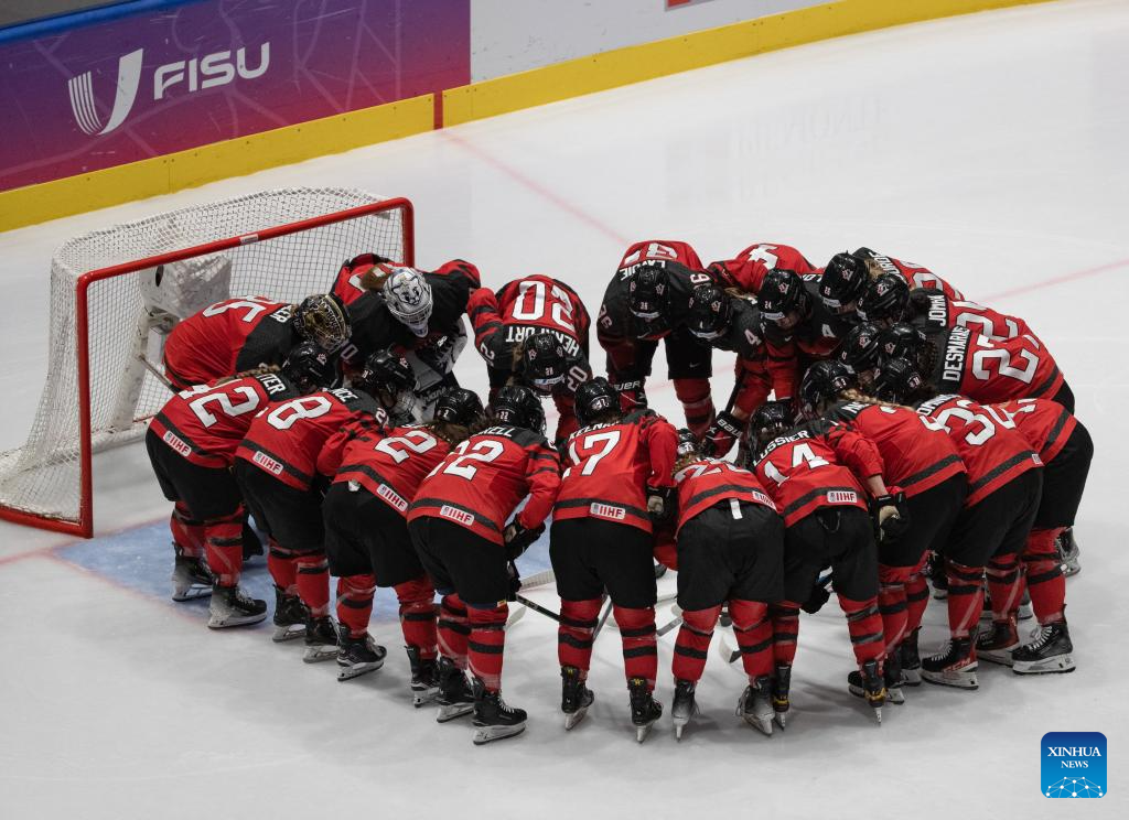 Players of Canada cheer before the women's ice hockey final match between the Czech Republic and Canada at the 2025 FISU Winter World University Games in Turin, Italy, Jan. 20, 2025. (Xinhua/Zhang Fan)