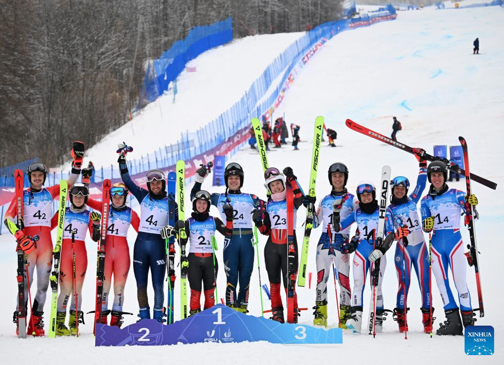 Gold medalist Team Sweden (C), silver medalist Team Switzerland (L) and bronze medalist Team France celebrate after the finals of the alpine skiing mixed team parallel competition at the 2025 FISU Winter World University Games in Bardonecchia, Italy, Jan. 20, 2025. (Xinhua/He Canling)