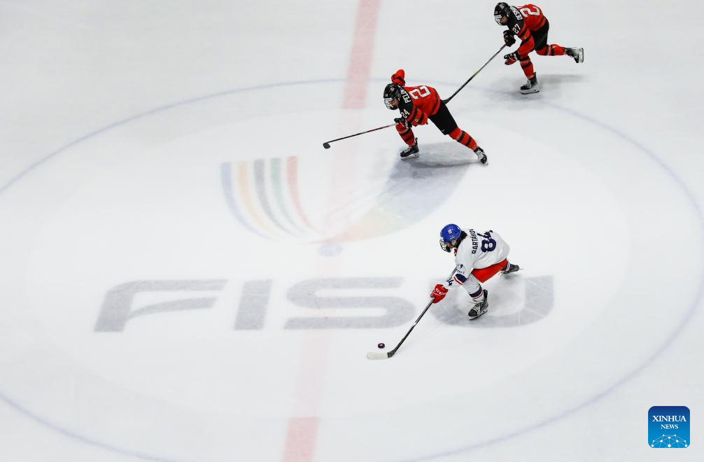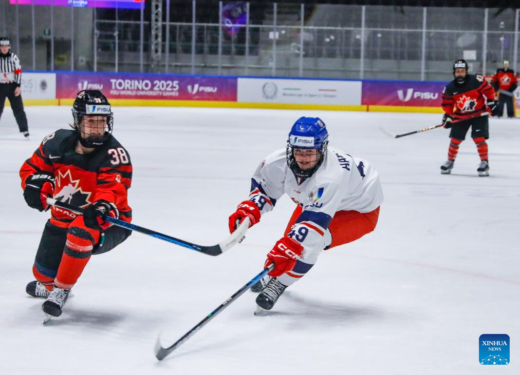Denisa Habartova (R) of the Czech Republic vies with Malory Dominico of Canada during the women's ice hockey final match between the Czech Republic and Canada at the 2025 FISU Winter World University Games in Turin, Italy, Jan. 20, 2025. (Xinhua/Zhang Fan)