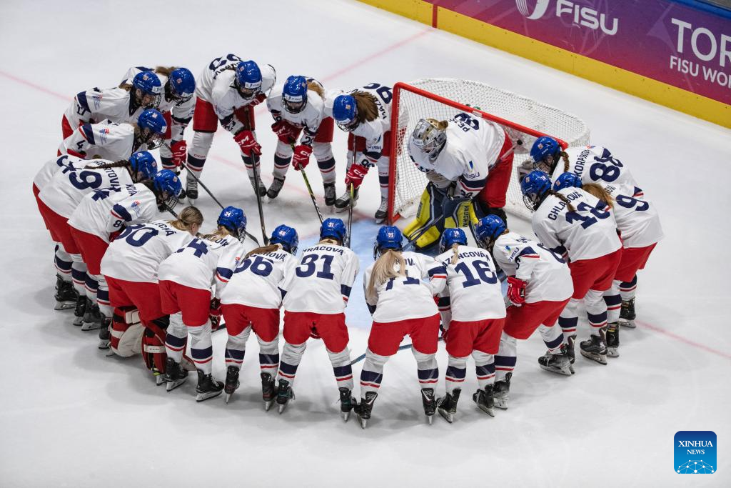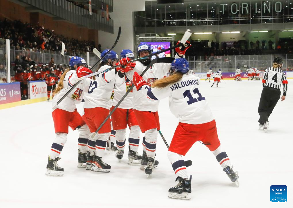 Players of the Czech Republic celebrate scoring during the women's ice hockey final match between the Czech Republic and Canada at the 2025 FISU Winter World University Games in Turin, Italy, Jan. 20, 2025. (Xinhua/Zhang Fan)