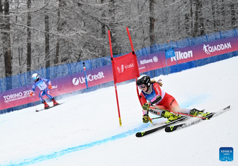 Mathilde Phillips (R) of Team Switzerland and Marjolaine Ollier of Team France compete during the semifinal of the alpine skiing mixed team parallel competition at the 2025 FISU Winter World University Games in Bardonecchia, Italy, Jan. 20, 2025. (Xinhua/He Canling)
