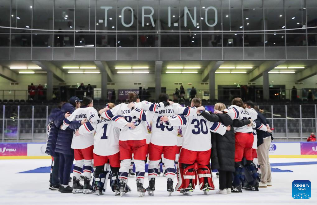 Players of the Czech Republic cheer before the women's ice hockey final match between the Czech Republic and Canada at the 2025 FISU Winter World University Games in Turin, Italy, Jan. 20, 2025. (Xinhua/Zhang Fan)