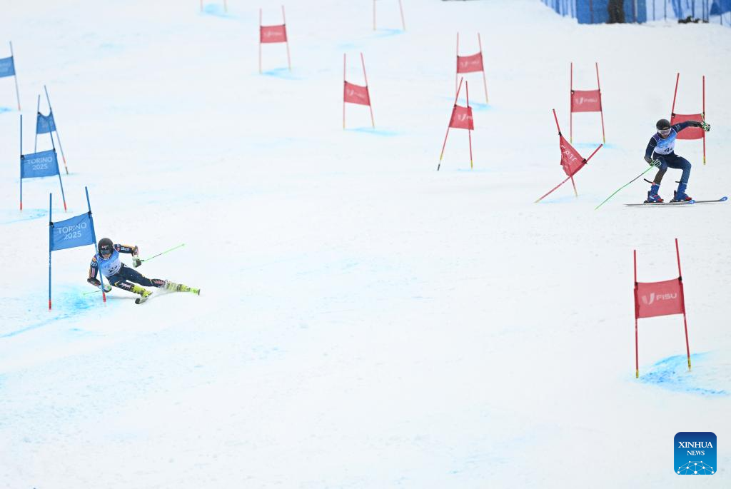 Axel Lindqvist (L) of Team Sweden and Loic Chable of Team Switzerland compete during the big final of the alpine skiing mixed team parallel competition at the 2025 FISU Winter World University Games in Bardonecchia, Italy, Jan. 20, 2025. (Xinhua/He Canling)