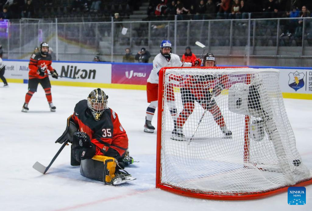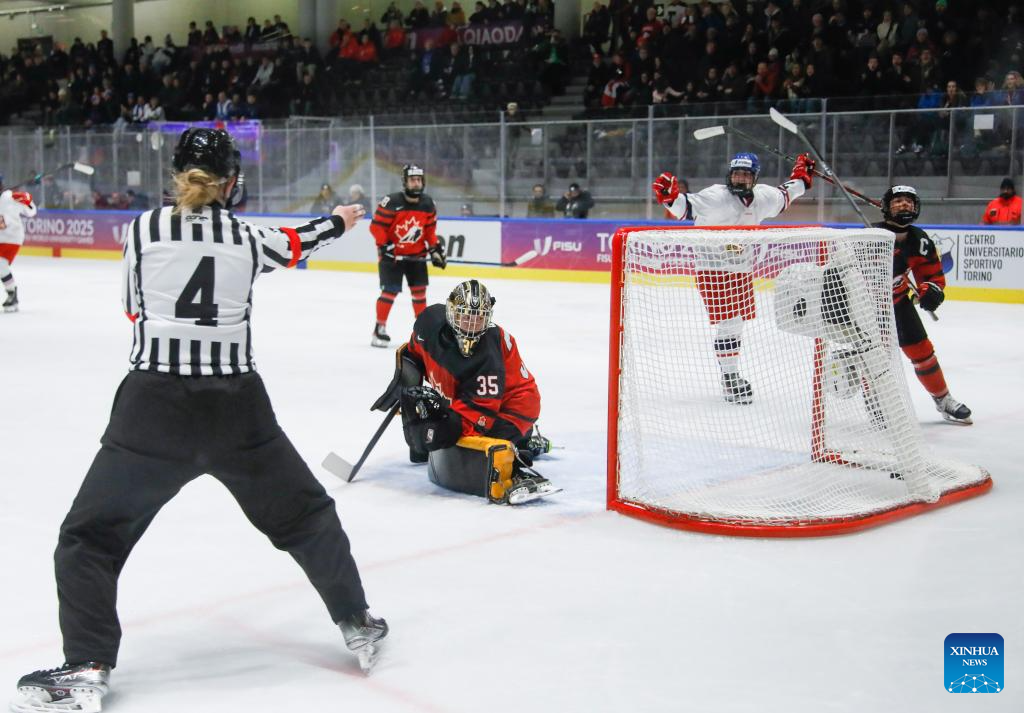 Grace Beer (C), goal keeper of Canada, fails to save the puck during the women's ice hockey final match between the Czech Republic and Canada at the 2025 FISU Winter World University Games in Turin, Italy, Jan. 20, 2025. (Xinhua/Zhang Fan)