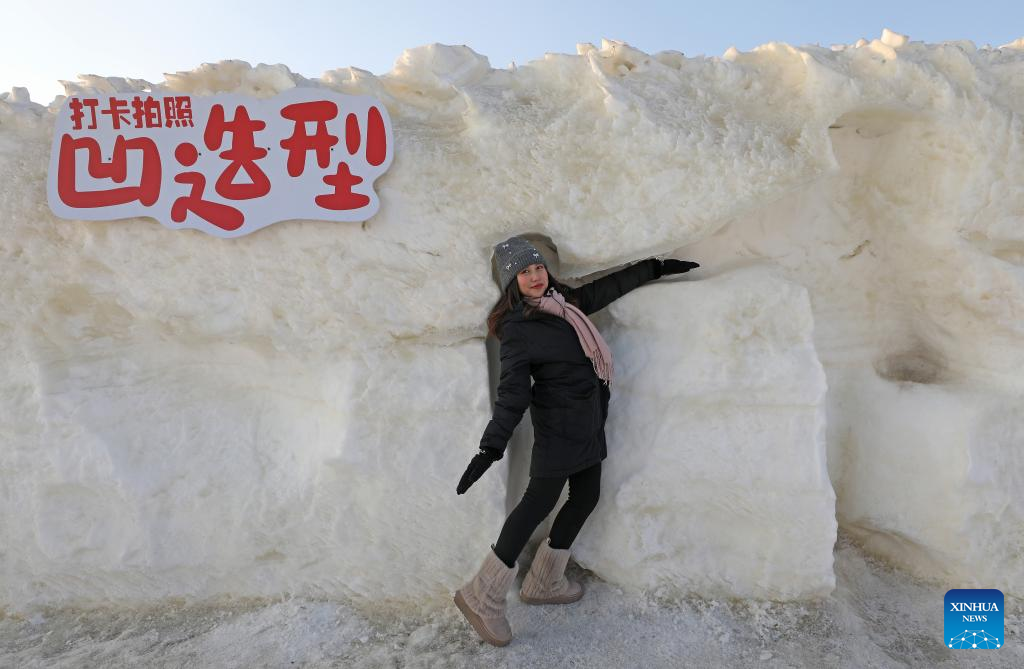 May Thet Hnynn, an international student from Myanmar, poses for a photo outside an ice maze at a creative agriculture industrial park in Shenyang, northeast China's Liaoning Province, Jan. 12, 2025. In recent years, Shenyang has explored its ice and snow tourism resources, attracting numerous tourists. (Xinhua/Yang Qing)