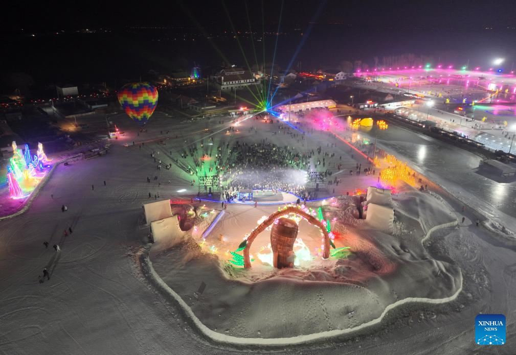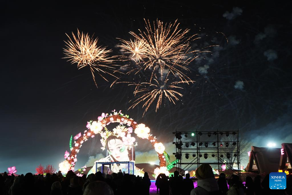 This photo taken on Jan. 12, 2025 shows the firework show at a creative agriculture industrial park in Shenyang, northeast China's Liaoning Province. In recent years, Shenyang has explored its ice and snow tourism resources, attracting numerous tourists. (Xinhua/Li Gang)