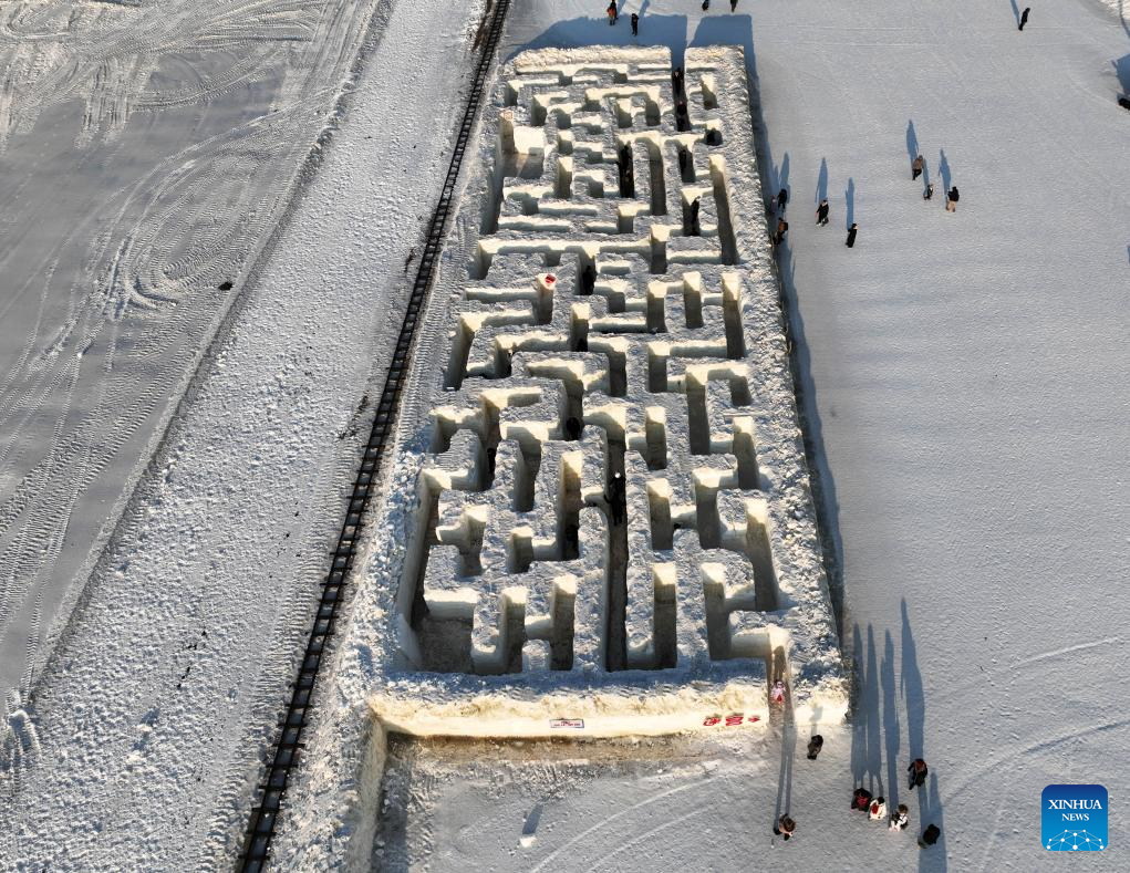 An aerial drone photo taken on Jan. 12, 2025 shows an ice maze at a creative agriculture industrial park in Shenyang, northeast China's Liaoning Province. In recent years, Shenyang has explored its ice and snow tourism resources, attracting numerous tourists. (Xinhua/Li Gang)