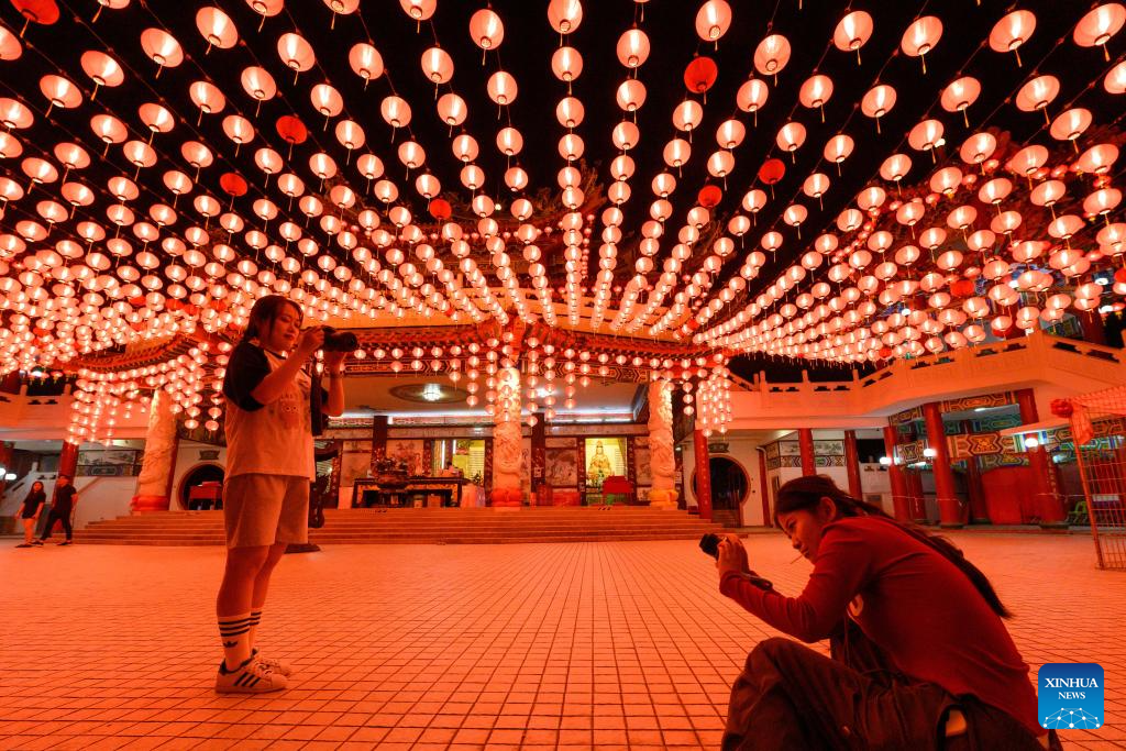 People view festive lanterns at the Thean Hou Temple in Kuala Lumpur, Malaysia, Jan. 21, 2025. A lighting ceremony was held here Tuesday to mark the upcoming Chinese New Year. (Xinhua/Chong Voon Chung)