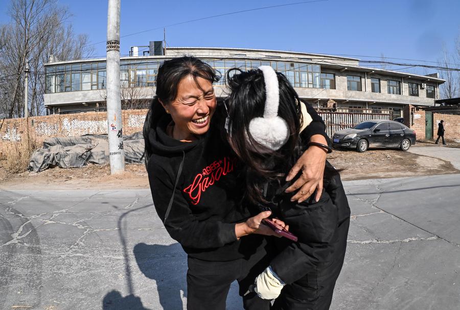 Wang Yanqing (L) hugs her younger daughter who waits for their arrival at the entrance to Zhongying Village of Cangzhou City, north China's Hebei Province, Jan. 20, 2025. (Xinhua/Chen Yehua)