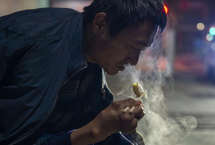 Kong Lingjian eats dumplings while waiting for work on the roadside in Hangzhou, east China's Zhejiang Province, Jan. 12, 2025. (Xinhua/Cai Yang)