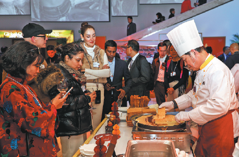 Participants try Tianjin crepe at a reception held by the Chinese city during the World Economic Forum Annual Meeting 2025 in Davos, Switzerland, on Tuesday. Tianjin, the host city of the 2025 Summer Davos (Annual Meeting of the New Champions), held the reception on Tuesday evening to mark the upcoming Spring Festival. (Peng Ziyang/Xinhua)