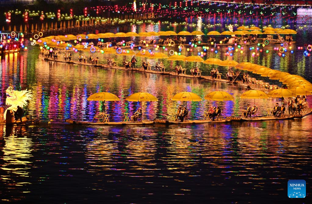 Tourists enjoy the night view by taking bamboo rafts on Gongshui River in Xuanen County, central China's Hubei Province, Jan. 21, 2025. As the 2025 Chinese New Year will fall on Jan. 29, excitement is palpable everywhere in China. The Chinese people immerse themselves in traditional customs and partake in the festivities. The Chinese New Year, or the Spring Festival, falls on next Wednesday, marking the beginning of the Year of the Snake. (Photo by Song Wen/Xinhua)