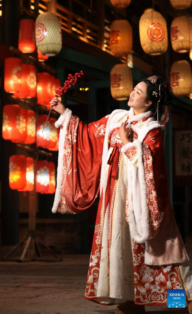 An artist performs at the scenic spot named "the City of Tang Dynasty (618-907)" in Xiangyang City, central China's Hubei Province, Jan. 21, 2025. As the 2025 Chinese New Year will fall on Jan. 29, excitement is palpable everywhere in China. The Chinese people immerse themselves in traditional customs and partake in the festivities. The Chinese New Year, or the Spring Festival, falls on next Wednesday, marking the beginning of the Year of the Snake. (Photo by Zhao Jun/Xinhua)