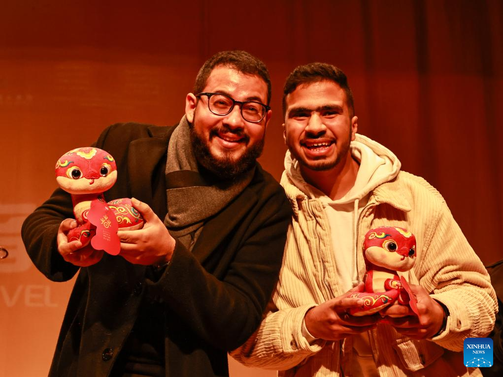 Moroccan spectators pose for a photo with plush snake toys during a concert to celebrate the upcoming Chinese Spring Festival in Rabat, Morocco, Jan. 15, 2025. (Xinhua/Huo Jing)