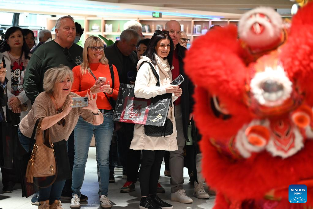Inbound tourists arriving by cruise ship watch a lion dance performance in Shanghai, east China, Jan. 8, 2025. According to Shanghai Municipal Administration of Culture and Tourism, Shanghai received approximately 6.7 million inbound trips in 2024, up 84 percent year-on-year. (Xinhua/Chen Aiping)